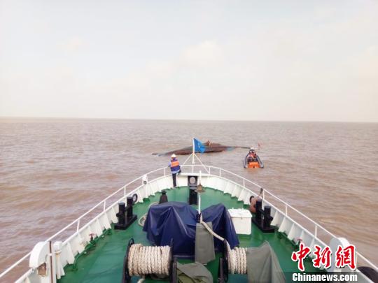 事發(fā)現(xiàn)場,一船倒扣在江中!骼 攝 截至發(fā)稿時,5名遇險人員已獲營救。 事故發(fā)生后,鹽城市海上搜救中心立即啟動海上搜救應急預案,協(xié)調海事、漁政、救助局等力量進行搜救。 -