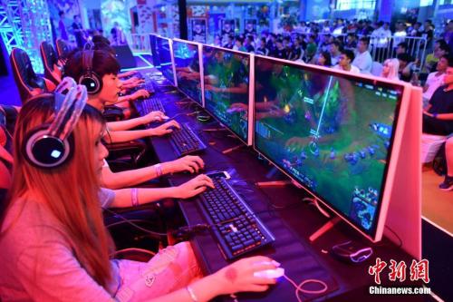 資料圖:2017中國·石家莊第十二屆國際動漫博覽交易會的電競現(xiàn)場,一場《英雄聯(lián)盟》比賽拉開“戰(zhàn)幕”。 中新社記者 翟羽佳 攝