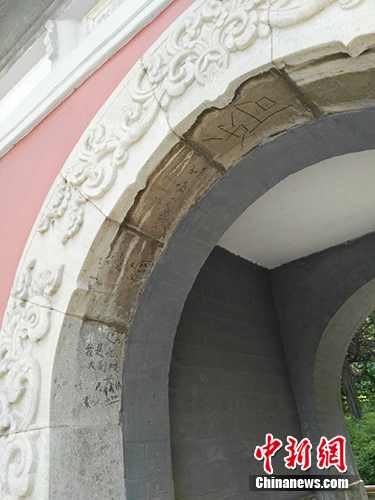 慈濟寺山門雖已經(jīng)過粉刷,但門洞中仍能看到不少涂鴉。中新網(wǎng)記者 宋宇晟 攝