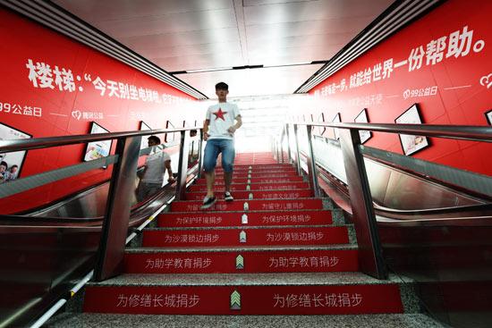 近日,杭州一地鐵站多了一道特別的“愛心臺階”。該樓梯上下兩端分別設(shè)置了紅外感應(yīng)器,當(dāng)乘客走完這59級臺階時,旁邊的大屏幕會記下步數(shù),并將這步數(shù)轉(zhuǎn)化為公益事業(yè)的捐款,因此吸引了不少杭州市民和游客前來走過“愛心臺階”。視覺中國供圖