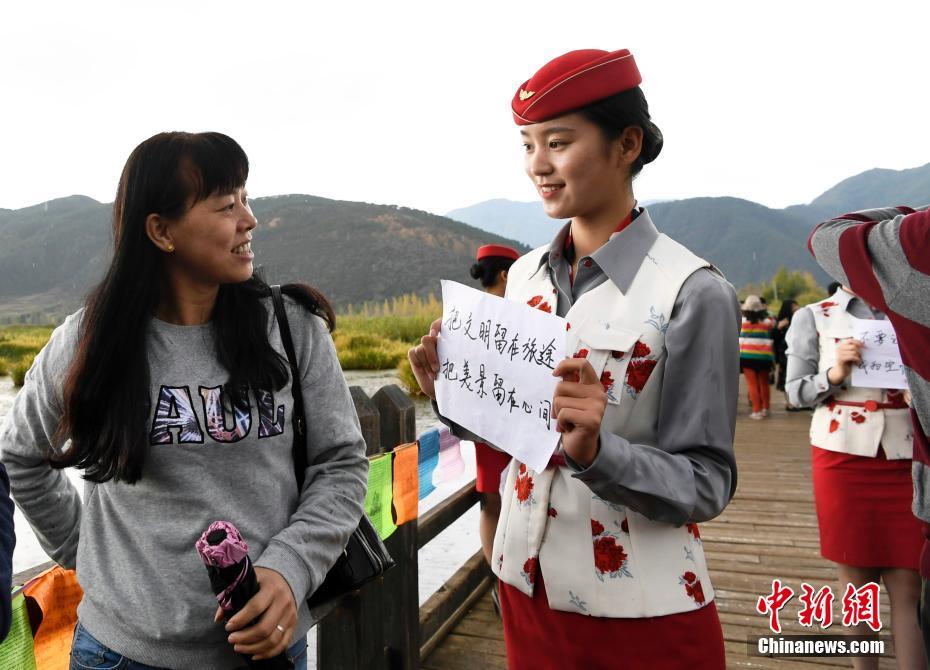 10月15日,四川西南航空專修學(xué)院的一群準(zhǔn)空姐空少作為志愿者現(xiàn)身四川鹽源瀘沽湖景區(qū),身體力行倡導(dǎo)生態(tài)環(huán)保。學(xué)生們走上當(dāng)?shù)刂摹白呋闃颉,向游客們宣傳環(huán)保知識。