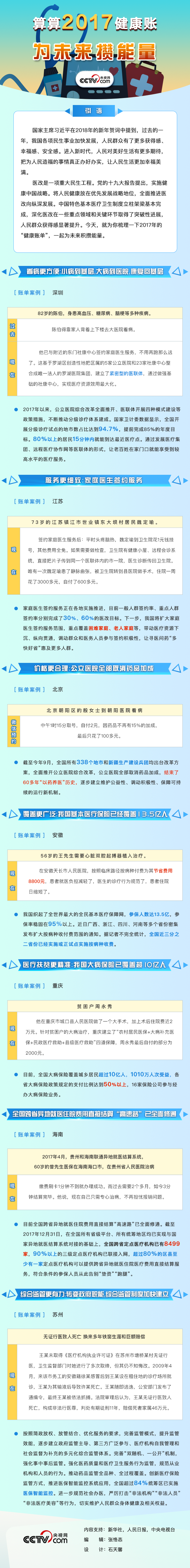 醫(yī)改是一項(xiàng)重大民生工程。黨的十九大報(bào)告提出,實(shí)施健康中國(guó)戰(zhàn)略。將人民健康放在優(yōu)先發(fā)展戰(zhàn)略地位,全面推進(jìn)醫(yī)改向縱深發(fā)展。中國(guó)特色基本醫(yī)療衛(wèi)生制度立柱架梁基本完成,深化醫(yī)改在一些重點(diǎn)領(lǐng)域和關(guān)鍵環(huán)節(jié)取得了突破性進(jìn)展,人民群眾獲得感顯著提升。今天,就為你梳理一下2017年的“健康賬單”,一起為未來(lái)積攢能量。