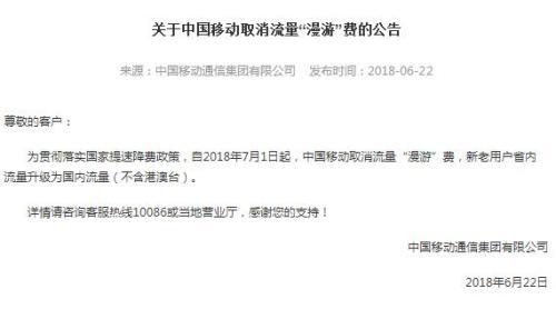 中國移動22日在官網(wǎng)發(fā)布關(guān)于取消流量“漫游”費的公告,公告稱,自2018年7月1日起,中國移動取消流量“漫游”費,新老用戶省內(nèi)流量升級為國內(nèi)流量(不含港澳臺)。