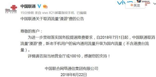 繼中國移動之后,中國聯(lián)通也于同日通過官方微博宣布:自2018年7月1日起,中國聯(lián)通取消流量“漫游”費,新老手機用戶的省內(nèi)通用流量升級為國內(nèi)流量(不含港澳臺流量)。