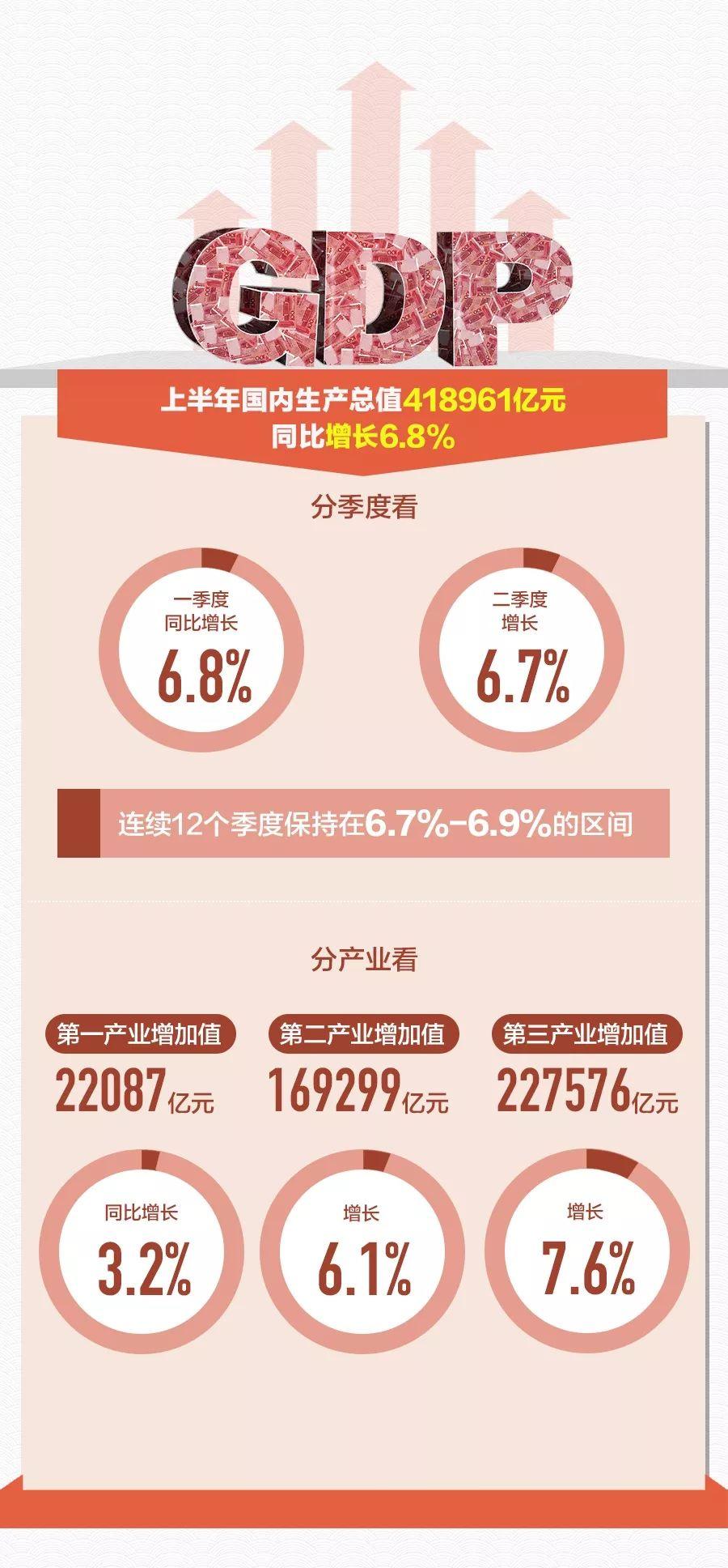 初步核算,上半年國(guó)內(nèi)生產(chǎn)總值418961億元,同比增長(zhǎng)6.8%。其中,第一產(chǎn)業(yè)同比增長(zhǎng)3.2%,第二產(chǎn)業(yè)增長(zhǎng)6.1%,第三產(chǎn)業(yè)增長(zhǎng)7.6%。