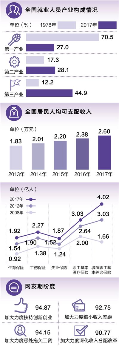 2017年末全國(guó)就業(yè)人員達(dá)7.76億人,比1978年增加3.75億人。不僅僅是數(shù)量上的變化,隨著我國(guó)經(jīng)濟(jì)結(jié)構(gòu)的持續(xù)優(yōu)化,就業(yè)結(jié)構(gòu)逐步改善,就業(yè)的渠道越來(lái)越寬了。