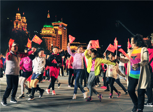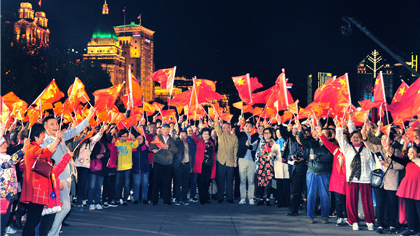 昆曲藝術(shù)家張軍、新聞主播葉蓉、和平飯店爵士樂隊、黃浦區(qū)勞模代表、春天少年合唱團(tuán)的少年們……出人意料地閃現(xiàn)在人流如梭的外灘,用不同的方式唱響《我和我的祖國》。外灘成了一片紅色的歡樂海洋:輪滑少年手執(zhí)國旗在人群前滑過,江邊和浦江游輪上的人們興奮地互相舞動著國旗,鐘樓在燈光投射下“身披”一面巨型國旗……越來越多的游人圍聚過來跟著一起高歌,人們拿出手機(jī)記錄下這一特別的時刻。歌曲結(jié)束時,歡呼聲響徹外灘!拔覑壑袊,我愛上!保⒆觽?nèi)杠S高呼。