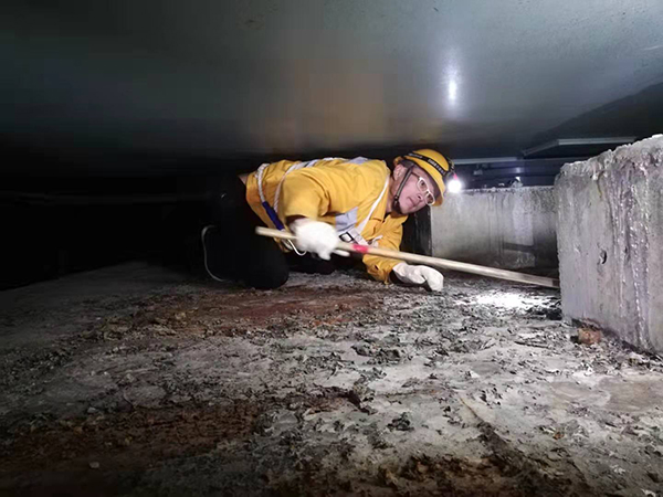 此處橋梁和橋墩之間高度僅50厘米。無法站著,甚至無法蹲著,身高1米8的作業(yè)人員楊正胸口貼地,雙肘摩擦爬到支座附近,開始檢查。像這樣的情況很多,在檢查梁體時,作業(yè)人員還需要先下半身坐在梁體橢圓形的檢查門,再將上半身盡力折疊到腿上,最后整個身子推進中空的梁體。