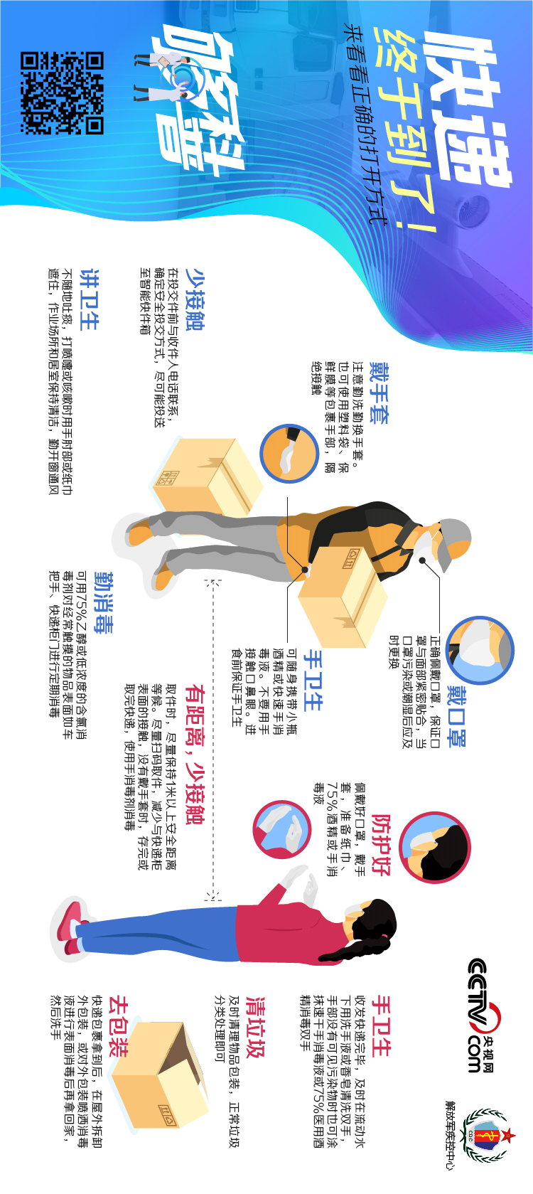 央視網(wǎng)消息:面對疫情,戴口罩、勤洗手、不聚會、勤通風(fēng)可以讓我們更好地保護(hù)自己和家人。那么,因生活或工作需要,當(dāng)快遞小哥已在大門口,我們該如何安全收發(fā)快遞呢?中國人民解放軍疾病預(yù)防控制中心副研究員石華、杜建國給出建議。