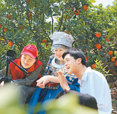 陳茲方(右一)在果園里直播。