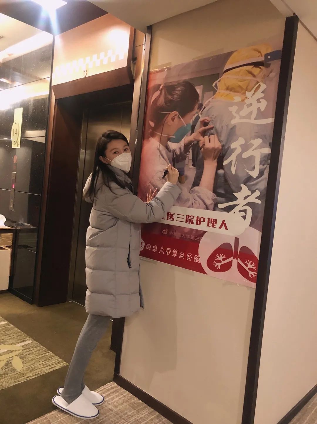 北京大學(xué)第三醫(yī)院危重醫(yī)學(xué)科護(hù)士張佳男在武漢駐地與張貼的海報(bào)合影(2月16日攝)。海報(bào)照片拍攝于1月29日凌晨三點(diǎn),張佳男和隊(duì)員們進(jìn)入華中科技大學(xué)同濟(jì)醫(yī)院中法新城院區(qū)隔離病房第一晚,當(dāng)時(shí)張佳男正在給隊(duì)友的防護(hù)服上寫字。新華社發(fā)