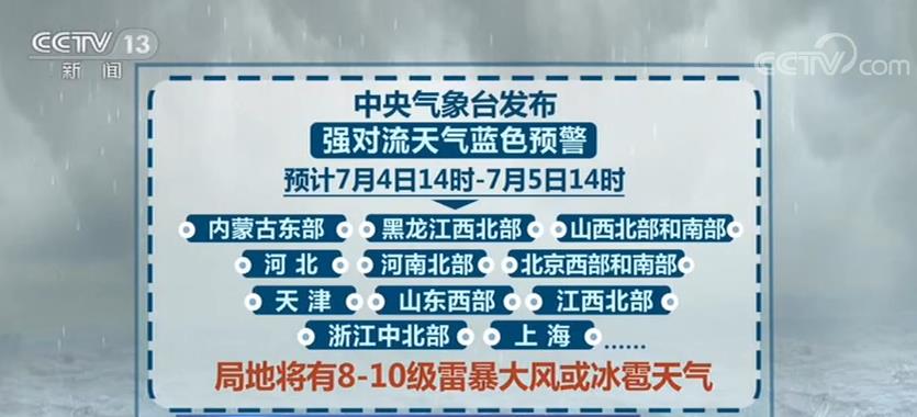 另一個(gè)是“強(qiáng)對流天氣藍(lán)色預(yù)警”。中央氣象臺今天10時(shí)發(fā)布強(qiáng)對流天氣藍(lán)色預(yù)警,預(yù)計(jì)今天下午2時(shí)至明天下午2時(shí),內(nèi)蒙古東部、黑龍江西北部、山西北部和南部、河北、河南北部、北京西部和南部、天津、山東西部、江西北部、浙江中北部、上海等地局地將有8—10級雷暴大風(fēng)或冰雹天氣。