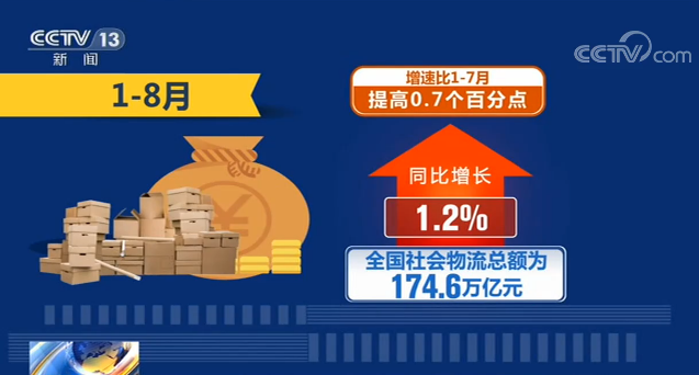 1—8月,全國社會(huì)物流總額為174.6萬億元,同比增長1.2%,增速比1—7月提高0.7個(gè)百分點(diǎn)。