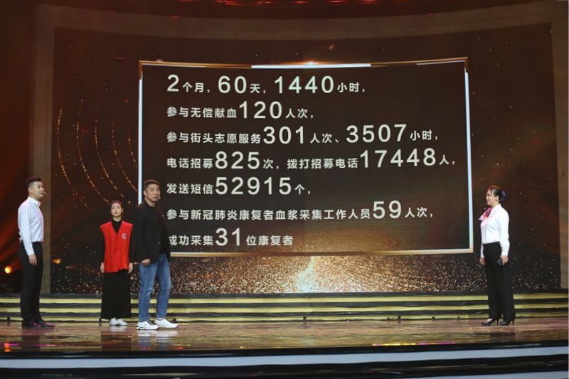 舞臺的屏幕上顯示一組數(shù)字:2個月,60天,1440小時,參與無償獻血120人次,參與街頭志愿服務301人次、3507小時,電話招募825次,撥打招募電話17448人,發(fā)送短信52915個,采集康復者血漿9批次,血漿15600毫升。