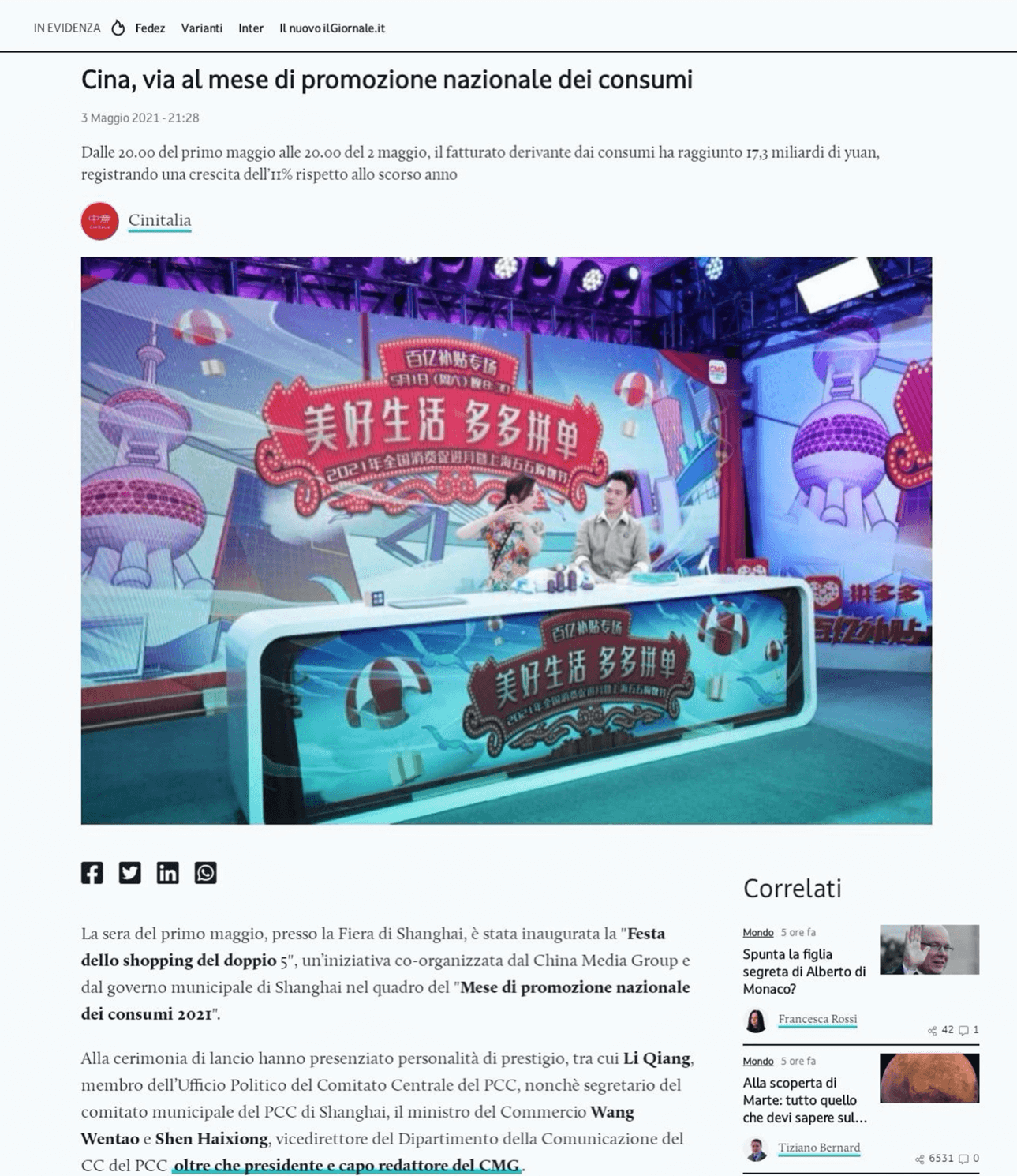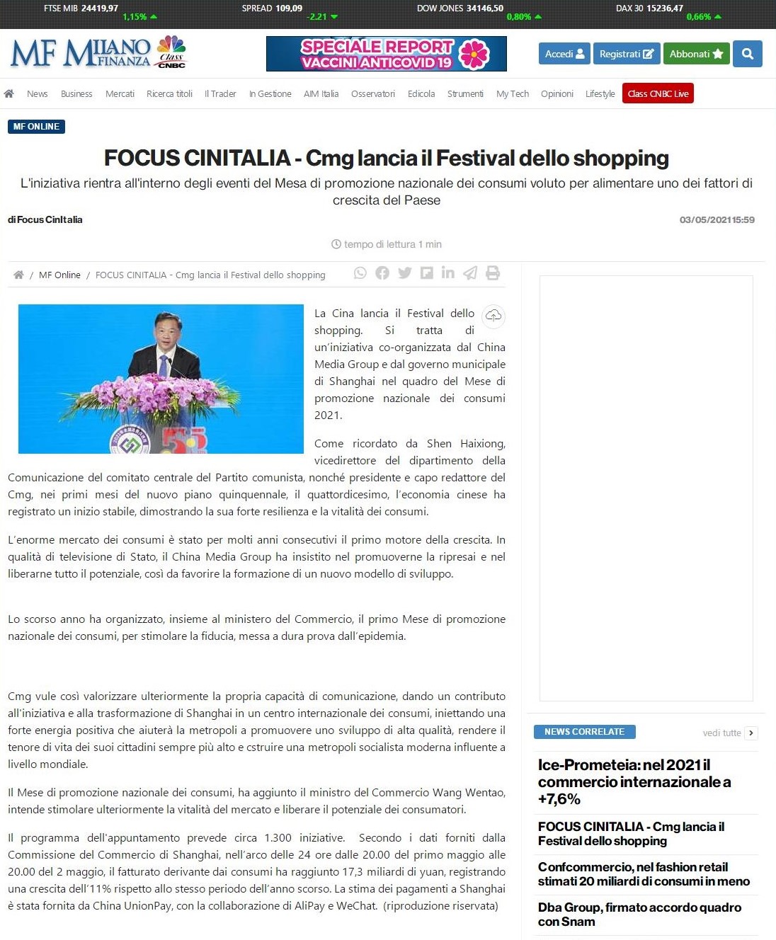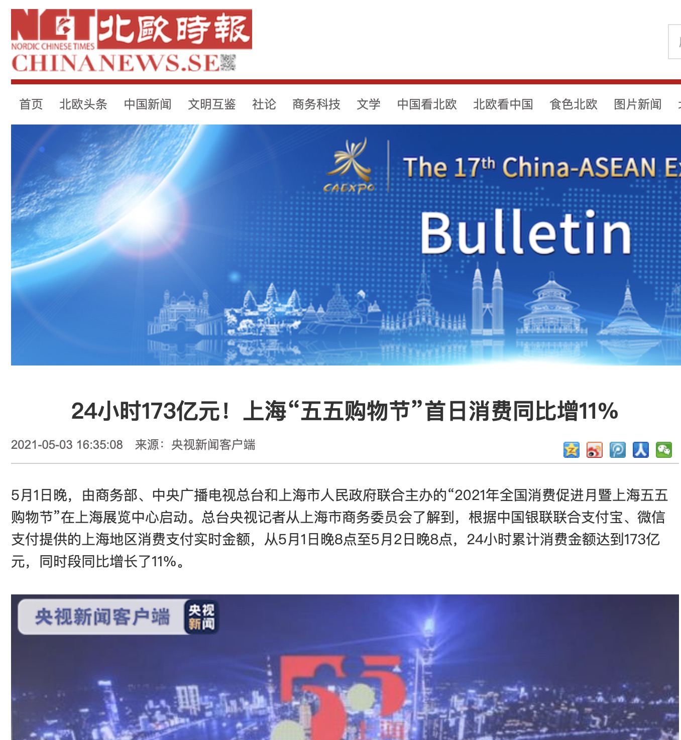 活動(dòng)引發(fā)海外媒體廣泛關(guān)注。截至5月4日,美國全國廣播公司CNBC財(cái)經(jīng)頻道、《歐洲時(shí)報(bào)》德文網(wǎng)、《北歐時(shí)報(bào)》網(wǎng)站、意大利《米蘭財(cái)經(jīng)報(bào)》網(wǎng)站、意大利《日報(bào)》網(wǎng)站、挪威國家廣播電視一臺(NRK 1)、日本最大的中國資訊門戶網(wǎng)站Record China、印度《每日力量報(bào)》網(wǎng)站、土耳其經(jīng)濟(jì)觀察網(wǎng)、《哈薩克斯坦實(shí)業(yè)報(bào)》網(wǎng)站、保加利亞新聞門戶網(wǎng)站“24小時(shí)”、埃及《今日消息報(bào)》、尼日利亞《領(lǐng)導(dǎo)者報(bào)》網(wǎng)站、尼羅河國際電視臺(Nile TV International)、越南國家電視臺綜合頻道(VTV1)、印尼艾爾辛達(dá)新聞網(wǎng)、柬埔寨Freshnews網(wǎng)站以及香港大公報(bào)、文匯報(bào)紛紛轉(zhuǎn)載轉(zhuǎn)引。多家媒體表示,中國經(jīng)濟(jì)在“十四五”規(guī)劃的第一個(gè)春天迎來穩(wěn)健開局,消費(fèi)市場規(guī)模持續(xù)擴(kuò)大成為發(fā)展動(dòng)力。