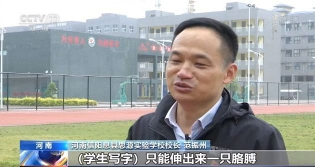 河南信陽息縣思源實(shí)驗(yàn)學(xué)校校長(zhǎng) 范振州:一個(gè)班里學(xué)生大概有100多人,坐在座位上兩個(gè)胳膊互相打架,(學(xué)生寫字)只能伸出來一只胳膊。