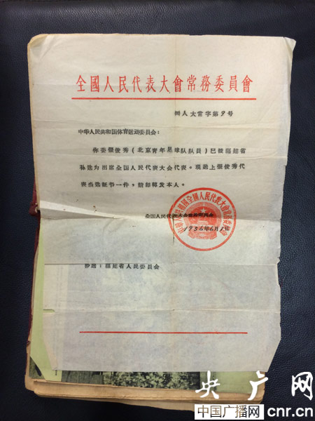 我是補選的一屆全國人大代表。1954年,中國第一個拿到世界冠軍的游泳運動員吳傳玉當(dāng)選為全國人大代表,后來他在一次飛機失事中遇難。所以1955年我接到人大發(fā)的通知,補選我為第一屆全國人民代表大會代表。事后聽體委的人講,我的代表資格是賀龍?zhí)崦模?/p>