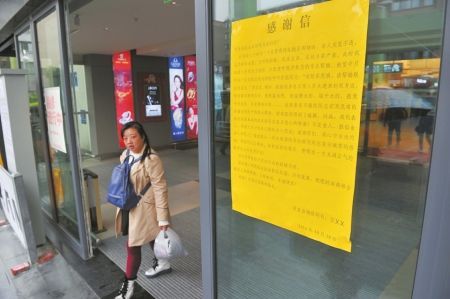 老人的感謝信被貼在商場(chǎng)門(mén)口。