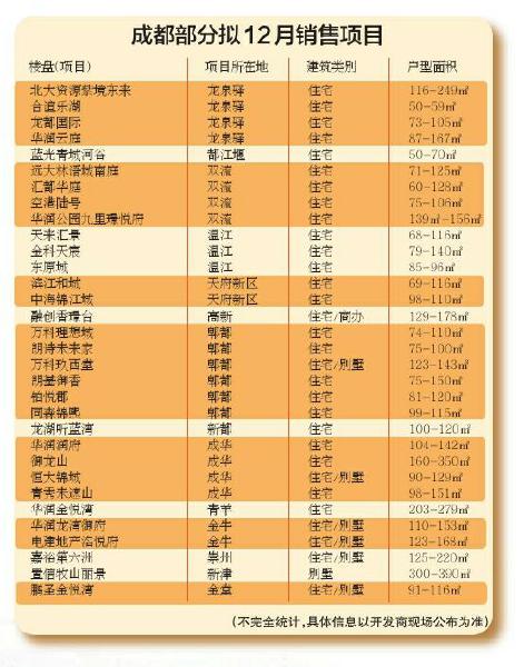 記者梳理龍泉驛、雙流、溫江、郫都、成華、青羊、金牛及都江堰、天府新區(qū)等地樓盤公開信息發(fā)現(xiàn),包括華潤、萬科、恒大、融創(chuàng)、龍湖、置信、藍(lán)光、朗詩、嘉裕、東原、金科、中海等品牌開發(fā)商在內(nèi),12月份預(yù)計(jì)有32個項(xiàng)目、8000多套房源待售,其中別墅物業(yè)項(xiàng)目有7個,住宅物業(yè)25個,產(chǎn)品面積從最小戶型套二到大面積套四套五戶型皆有,剛需及改善購房者的選擇性范圍都比較大。某開發(fā)商營銷負(fù)責(zé)人告訴記者,目前公司正在等待相關(guān)部門落實(shí)具體的搖號選房操作辦法,一旦獲得預(yù)售證就將開盤。