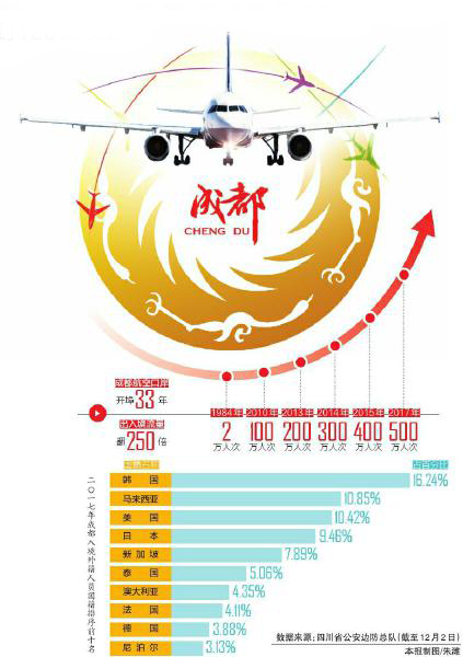 杜進有介紹,成都航空口岸1984年開埠,當年出入境流量僅2萬人次,歷經26年,2010年出入境流量首次突破100萬人次。隨著國際航線網絡的不斷拓展和口岸服務水平的不斷提升,2013年、2014年、2015年成都航空口岸出入境流量先后突破200萬人次、300萬人次、400萬人次,2017年歷史性突破500萬人次大關。這對成都有怎樣的意義?