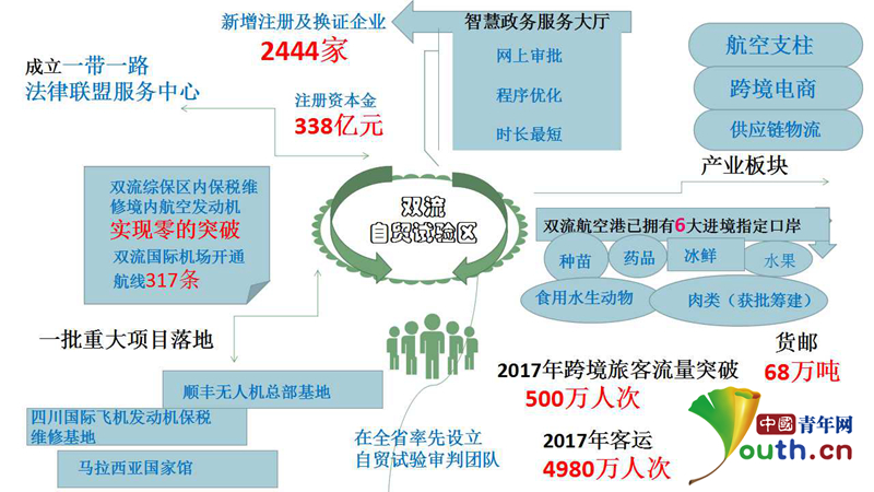 中國青年網(wǎng)成都6月7日電(劉洪材 記者 李建軍 實習(xí)生 張徐)在成都雙流自貿(mào)試驗區(qū)34.01平方公里的“試驗田”上有一張成績單:全面完成2017年87項改革試驗任務(wù)、去年實現(xiàn)主營業(yè)務(wù)收入1429億元、稅收81.4億元(含海關(guān)稅收)、自貿(mào)試驗區(qū)智慧政務(wù)服務(wù)大廳開發(fā)運營、新增注冊及換證企業(yè)2444家、綜保區(qū)內(nèi)貨物流轉(zhuǎn)由9小時縮短至9分鐘、2017年實現(xiàn)旅客吞吐量4980萬,全國排名第四……