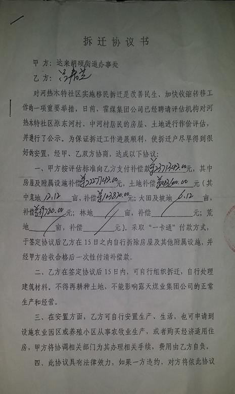 2011年下半年又開始啟動(dòng)拆遷,2012年10月政府和村民按照原評(píng)估方案簽訂補(bǔ)償協(xié)議。村民按照協(xié)議15日內(nèi)進(jìn)行了拆遷,拆完之后由于補(bǔ)償金額過大,露天礦業(yè)不認(rèn)可政府與村民之間的補(bǔ)償協(xié)議,無(wú)奈政府終止履行。