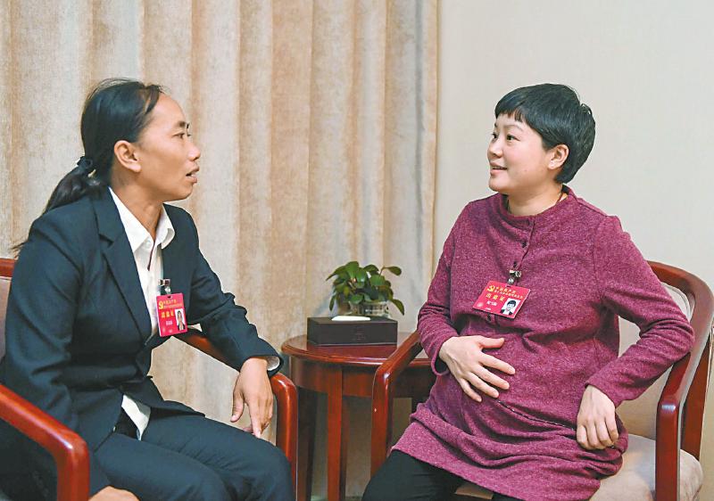 倪雪梅與十九大代表、夾江縣青州鄉(xiāng)建國村黨支部書記董春容交談。