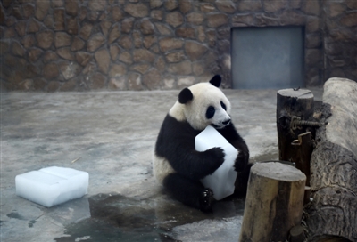 8月29日,成都大熊貓繁育基地的大熊貓抱著冰塊玩耍 攝影記者 張士博