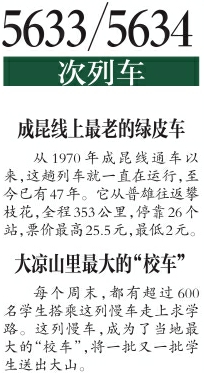 這趟火車,車次為5633/5634次,是成昆線上四川境內(nèi)最后的兩列慢車之一,從1970年成昆線通車以來(lái)就一直在運(yùn)行,至今已有47年。它從普雄往返攀枝花,全程353公里,?26個(gè)站,票價(jià)最高25.5元,最低2元。