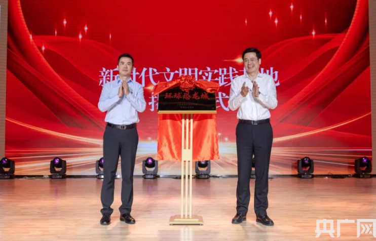 常州市委常委、宣傳部部長陳濤(右)與恐龍園文化旅游集團(tuán)黨委書記、董事局主席、首席執(zhí)行官沈波(左)共同為環(huán)球恐龍城“新時(shí)代文明實(shí)踐基地”揭牌(央廣網(wǎng)發(fā) 恐龍園集團(tuán)供圖)