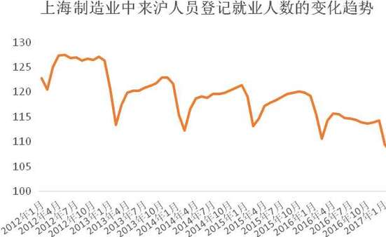 據(jù)介紹,2017年3月,上海制造業(yè)登記就業(yè)人數(shù)為189.8萬(wàn)人,同比減少5.3%。其中,外省市來滬人員共110.3萬(wàn)人,與五年前同期水平相比累計(jì)減少14.8萬(wàn)人,下降幅度為11.8%。從近年來的變化趨勢(shì)看,上海制造業(yè)登記就業(yè)人數(shù)總體呈現(xiàn)震蕩下行的趨勢(shì)。制造業(yè)登記就業(yè)人數(shù)占上海登記就業(yè)總?cè)藬?shù)的比重,也從2012年3月的28.4%,下降到2017年3月的21.2%。