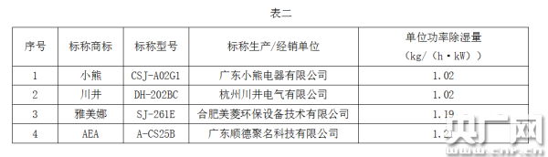 作為評(píng)價(jià)除濕機(jī)除濕效率的一個(gè)重要指標(biāo),除濕效率(單位輸入功率除濕量)同樣差異明顯。據(jù)了解,單位輸入功率除濕量是名義除濕量與輸入功率的比值,數(shù)值越高說明產(chǎn)品在相同耗電量的情況下,除濕能力越強(qiáng),產(chǎn)品越節(jié)能。測(cè)試結(jié)果顯示,數(shù)值最高達(dá)到1.85 kg/(h·kW),最低的為1.02 kg/(h·kW),其中3件樣品的數(shù)值在1.6 kg/(h·kW)以上,除濕效率高;4件樣品在1.3 kg/(h·kW)以下,除濕效率較低(詳見表二)。例如輸入功率為0.209kW的小熊除濕機(jī)(標(biāo)稱型號(hào):CSJ-A02G1),其單位輸入功率除濕量?jī)H為1.02 kg/(h·kW),兩者相差超過50%。