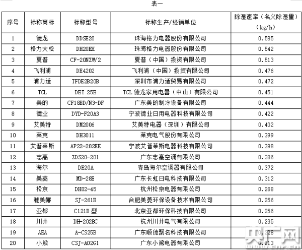 在除濕速率(名義除濕量)上,20件樣品差異較大。測(cè)試結(jié)果顯示,數(shù)值最高達(dá)到0.585 kg/h,最低為0.213 kg/h,相差近2倍,其中3件樣品的數(shù)值在0.5 kg/h以上,除濕效果上佳;6件樣品在0.3 kg/h以下,除濕效果較低。(詳見表一)。