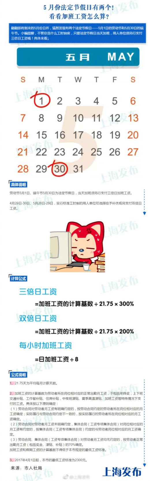 據(jù)上海發(fā)布,除了馬上到來的勞動節(jié),5月還有端午節(jié)小長假哦~萬一你要加班,加班費該怎么算?@上海12333 說,勞動節(jié)5月1日、端午節(jié)5月30日為法定節(jié)假日,當(dāng)天加班須另行支付三倍日加班工資;4月29日-30日、5月28日-29日,可給予補休或另支付雙倍日工資。今年4月1日起,本市最低工資已調(diào)為2300元/月。