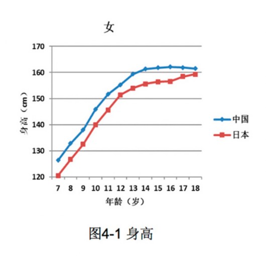 譬如,7-18歲中日兒童青少年(男)身高統(tǒng)計中,除12歲外,中國男生均顯著高于日本男生。中國女生各年齡段也均顯著高于日本女生。