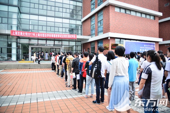 圖片說明:參加上海交通大學(xué)2017年綜合評(píng)價(jià)錄取改革試點(diǎn)校測(cè)面試的考生們,正在考場外列隊(duì)有序等待進(jìn)入。魏楨琦攝