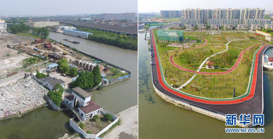 吳淞江北岸整治中(左圖)和整治后(右圖)。 (新華網(wǎng) 發(fā))