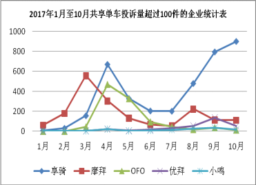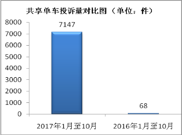 央廣網(wǎng)上海11月16日消息(記者傅聞捷)今年以來,共享單車投訴量呈爆發(fā)式增長。2017年1月至10月,上海市消保委共受理相關(guān)投訴7147件。投訴量位居前三位的分別是享騎、摩拜和OFO。其中,享騎的投訴量增長明顯,達(dá)3771件,遠(yuǎn)高于其他共享單車企業(yè)。