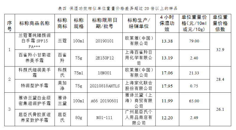 消費(fèi)者在使用護(hù)手霜時(shí)往往只關(guān)注商品售價(jià),而忽略單位重量商品價(jià)格上的差異。本次比較試驗(yàn)結(jié)果顯示,一些樣品4小時(shí)保濕功效接近,但單位重量?jī)r(jià)格差異明顯。有3件樣品與其有相似保濕功效的樣品在單位重量?jī)r(jià)格差異超過20倍以上(見表四)。