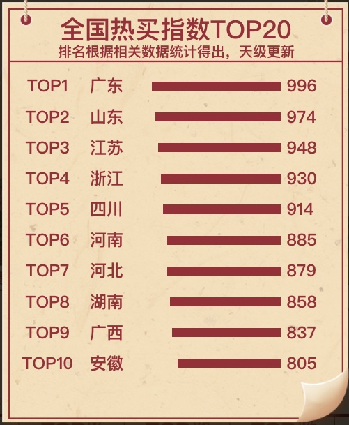 ▲榜單顯示,在支持國貨這件事上,廣東、山東、江蘇、浙江、四川等地的消費(fèi)者“毫不手軟”。