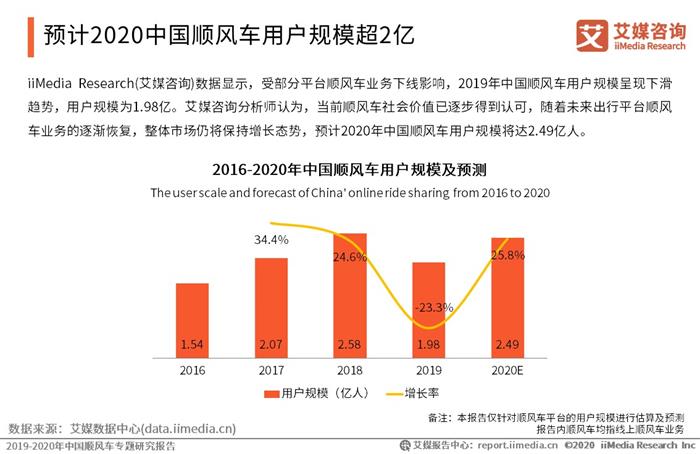 iiMedia Research(艾媒咨詢)數(shù)據(jù)顯示,受部分平臺順風(fēng)車業(yè)務(wù)下線影響,2019年中國順風(fēng)車用戶規(guī)模呈現(xiàn)下滑趨勢,用戶規(guī)模為1.98億。艾媒咨詢分析師認(rèn)為,順風(fēng)車憑借價格實(shí)惠、舒適便捷、共享環(huán)保的優(yōu)勢滿足用戶個性、多元的出行需求。隨著順風(fēng)車行業(yè)安全建設(shè)的推進(jìn)及平臺服務(wù)的升級,在不同生活場景下,用戶對順風(fēng)車的需求日益增多。當(dāng)前順風(fēng)車社會價值已逐步得到認(rèn)可,隨著未來出行平臺順風(fēng)車業(yè)務(wù)的逐漸恢復(fù), 整體市場仍將保持增長態(tài)勢,預(yù)計2020年中國順風(fēng)車用戶規(guī)模將達(dá)2.49億人。