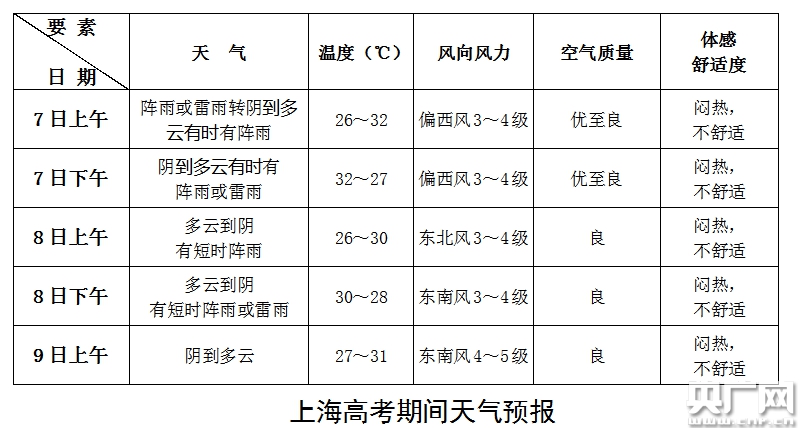 上海市氣象局提醒,高考期間,由于濕度大、氣溫高,體感悶熱,請(qǐng)保持考場(chǎng)空氣流通,適當(dāng)準(zhǔn)備清涼物品。7~8日有陣雨或雷雨,需做好相關(guān)人員的避雨、雷電防護(hù)安排。