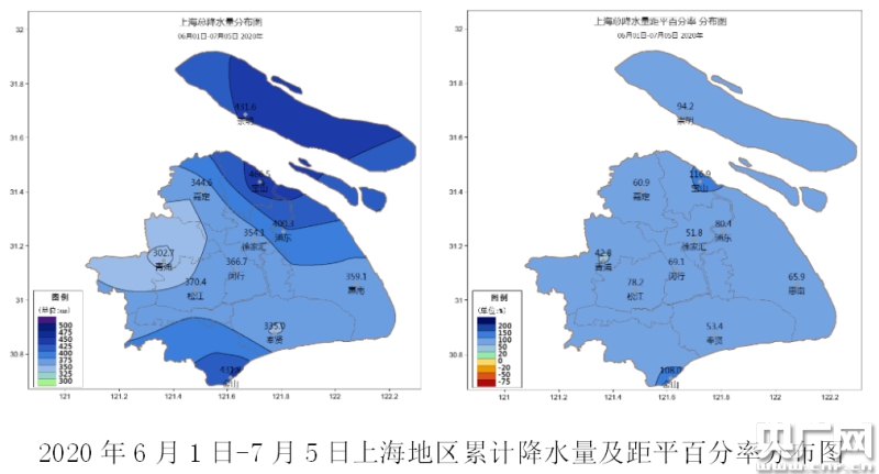 自6月1日入汛以來,上海全市平均累計(jì)降水量為378.4毫米(截止到7月5日),較常年(1981-2010年)同期偏多近8成,占常年汛期雨量(6-9月,614.0毫米)的6成以上。市區(qū)徐家匯站為354.1毫米,較常年同期偏多5成;郊區(qū)在302.7(青浦)-466.5(寶山)毫米之間,較常年同期偏多4成-1.2倍。目前,上游太湖流域已出現(xiàn)超警戒水位。