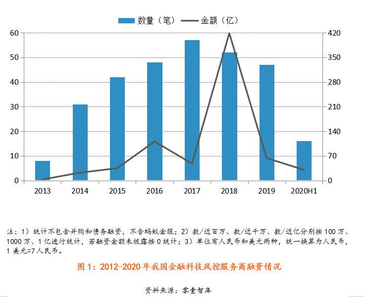 據(jù)報(bào)告數(shù)據(jù)顯示,2013-2019年間我國(guó)金融科技風(fēng)控廠商融資事件數(shù)整體呈逐年上升的趨勢(shì),2017年達(dá)到峰值,融資事件為57起;但從2018年開始,連續(xù)兩年出現(xiàn)下滑趨勢(shì),2019年融資事件數(shù)為47起。融資金額整體呈現(xiàn)增長(zhǎng)趨勢(shì),2018年披露事件的融資總額最高,為418.6億元,2019年融資金額為63.5億元。