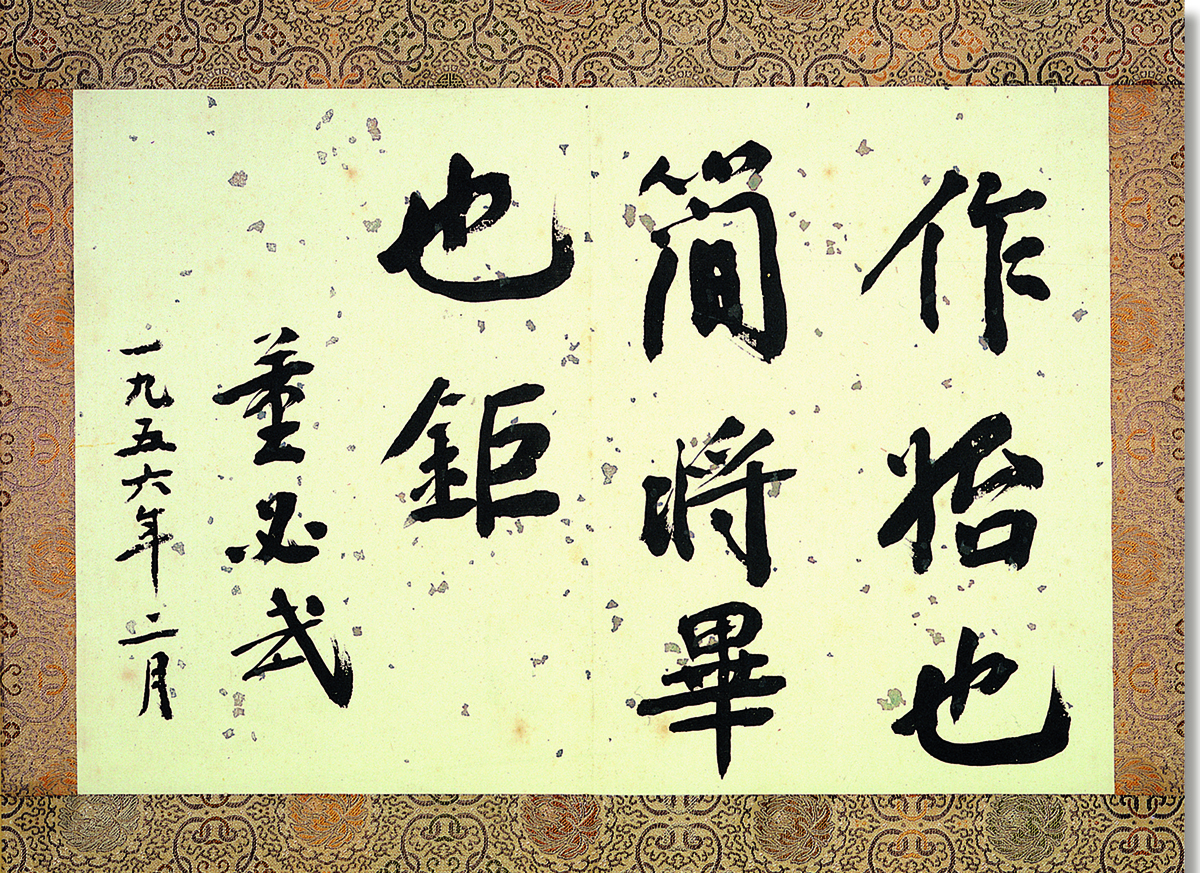 一個(gè)牛皮紙袋從藏品柜中拿出,戴著白手套的工作人員小心翼翼取出一張冊頁,上書“作始也簡,將畢也鉅”,落款為“董必武 一九五六年二月”。