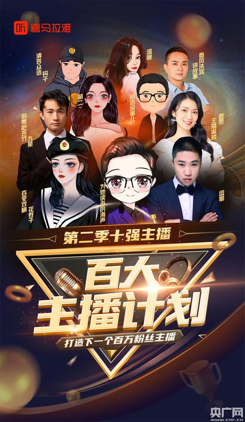 “百大主播計(jì)劃”由喜馬拉雅直播于2020年9月發(fā)起,為期一年,將通過尋找100種獨(dú)特的聲音,造血100名潛力主播,組成“百大主播”強(qiáng)大陣營(yíng),進(jìn)一步賦能平臺(tái)主播出圈與商業(yè)變現(xiàn),打造優(yōu)質(zhì)多元的內(nèi)容生態(tài)。第一季10強(qiáng)主播在喜馬拉雅“直播+錄播”一體化策略的扶持下,用戶收聽數(shù)據(jù)較扶持前已翻倍。第二季比賽以“以聲繪世界”為主題,持續(xù)面向全網(wǎng)征集優(yōu)質(zhì)好聲音,尋找人氣與實(shí)力并存的聲音偶像。