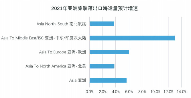 隨著區(qū)域全面經(jīng)濟(jì)伙伴關(guān)系協(xié)定(RCEP)成功簽署、中歐全面投資協(xié)定(CAI)談判完成,區(qū)域經(jīng)濟(jì)一體化成為大趨勢(shì)。保障國(guó)際供應(yīng)鏈穩(wěn)定和風(fēng)險(xiǎn)可控,在區(qū)域內(nèi)把產(chǎn)業(yè)鏈、供應(yīng)鏈配齊,保障極端情況下的生產(chǎn)可靠性與運(yùn)力有效性成為重點(diǎn)。數(shù)據(jù)顯示,亞洲區(qū)域內(nèi)航線運(yùn)量增長(zhǎng)具有較大潛力,2021年亞洲集裝箱出口海運(yùn)量預(yù)計(jì)將增長(zhǎng)5.6%,其中,亞洲到中東/印度次大陸等航線增速更快。