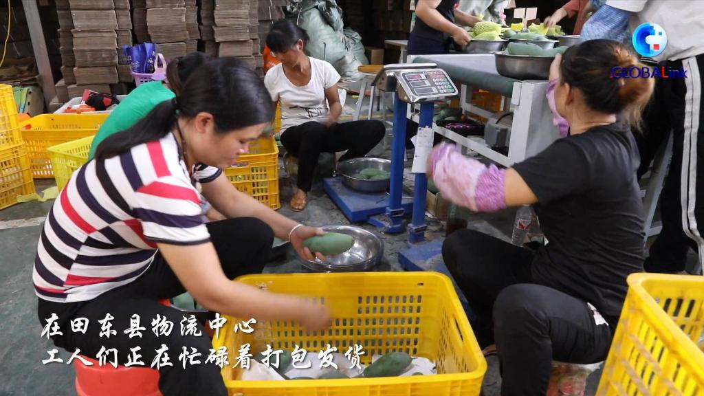 田東縣目前有3000多個(gè)電子店鋪銷售芒果,網(wǎng)絡(luò)覆蓋全國。在田東縣物流中心,工人們正在忙碌著打包發(fā)貨。農(nóng)村電商的蓬勃發(fā)展不僅為像黃尚善一樣的返鄉(xiāng)青年提供創(chuàng)業(yè)機(jī)遇,也提供了更多的就業(yè)機(jī)會(huì)。