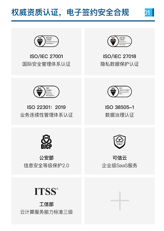 上上簽電子簽約將安全合規(guī)與標(biāo)準(zhǔn)遵從融入產(chǎn)品設(shè)計與安全運(yùn)營,持續(xù)優(yōu)化整體安全能力和業(yè)務(wù)保護(hù)水平。據(jù)安全白皮書披露,至目前為止,上上簽電子簽約于行業(yè)內(nèi)率先獲得ISO27001國際安全認(rèn)證、ISO27018隱私數(shù)據(jù)保護(hù)認(rèn)證、公安部“信息安全等級保護(hù)三級”認(rèn)證、工信部“可信云服務(wù)”認(rèn)證、工信部“云計算服務(wù)能力標(biāo)準(zhǔn)符合性評估三級”認(rèn)證、“ISO 22301:2019業(yè)務(wù)連續(xù)性管理體系”認(rèn)證,并獲得“英國BSI協(xié)會頒發(fā)的全球首張ISO38505-1數(shù)據(jù)治理”認(rèn)證證書,以七大全球權(quán)威安全資質(zhì)推動行業(yè)安全技術(shù)門檻不斷提升。