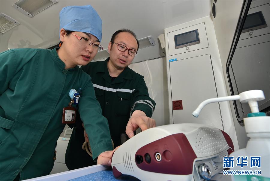 5月11日,許鵬飛為張娣介紹急救車(chē)上新進(jìn)的呼吸機(jī)的使用方法。 許鵬飛坐著急救車(chē)與時(shí)間“賽跑”,老婆張娣在手術(shù)室里搶救患者……結(jié)婚11年來(lái),這對(duì)護(hù)士夫妻攜手奮斗在救護(hù)一線! -